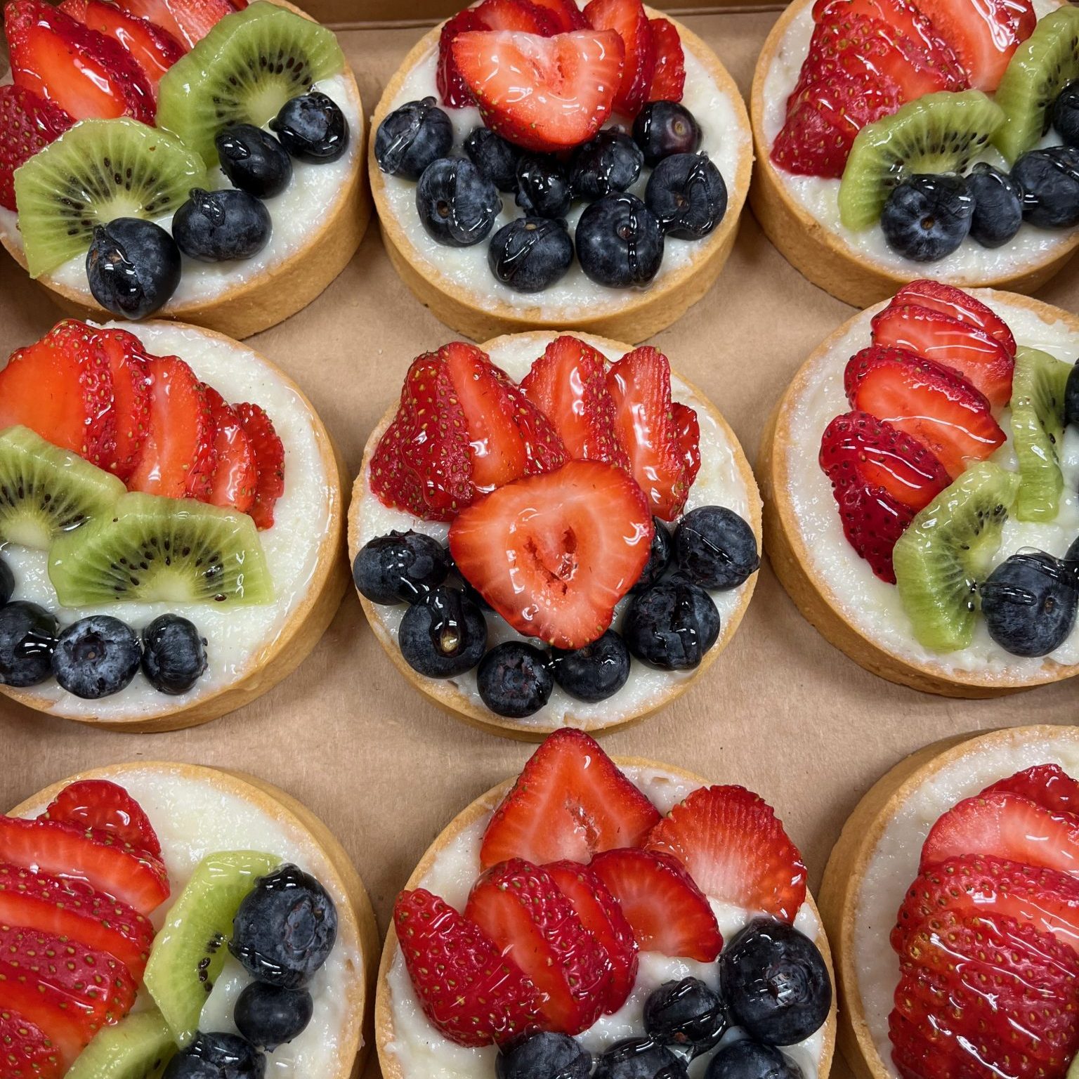 A 3″ sweet shortcrust base, filled with our house-made vanilla bean custard and topped with fresh seasonal fruit and berries. A staple in the cold case and available every day (unless sold out).